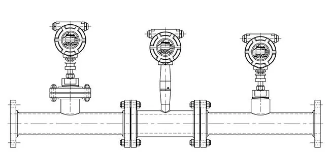 Medidor para montagem por inserção, estrategicamente instalado dentro da tubulação, ideal para medição volumétrica ou compensação de vazão de líquidos com linha de 2” a 72” (DN25 a DN200), temperaturas de (-200 a 400°C), pressão ANSI CLASS 1500 (PN 250).